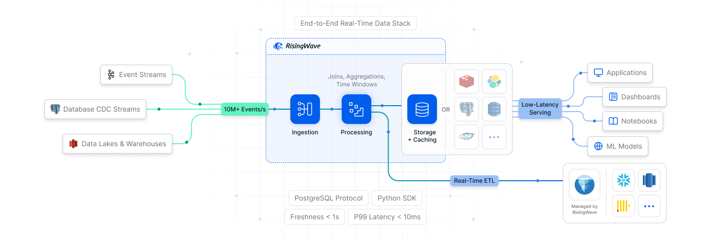 RisingWave is wire-compatible with PostgreSQL, enabling:- Expressive SQL: Supports structured, semi-structured, and unstructured data with a familiar SQL dialect.